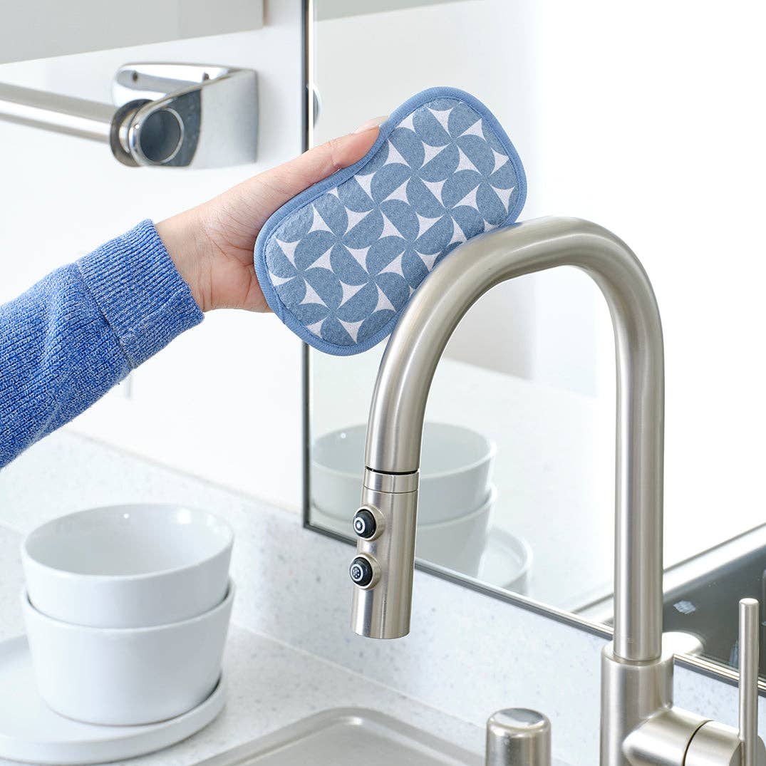 A set of 4 hard working microfiber scrubbies consists of 2 coordinating designs - contemporary Matisse style blue coneflowers and an arched geometric pattern. These are perfect kitchen clean up helpers.
