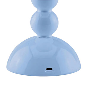 This Pale Denim one-of-a-kind rechargeable lamp features a Bobbin-Shaped design. It offers up to 10 hours of battery life on its brightest setting and has three adjustable light levels.