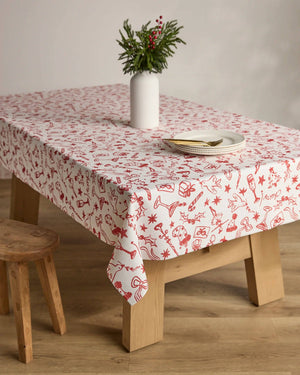 Tablecloth The Table — Covered. Made for meaningful gatherings and everyday meals, the Geometry Tablecloth brings beauty and ease to the center of your home. Lightweight, soft, and stain-resistant, it’s made from 100% post-consumer recycled materials and designed to drape effortlessly—no ironing, no fuss. Whether you’re dressing up a celebration or just elevating breakfast, this tablecloth brings intention to the table. Medium 60" x 90" SKU: TC-MF-M-holiday-doodles GTIN/UPC: 00840392764360 Large 62" x 108" SKU: TC-MF-L-holiday-doodles GTIN/UPC: 00840392764377 ... * ♺ Made from post-consumer recycled materials * Two sizes: 60” x 90” and 62” x 108” * Soft, lightweight, and stain-resistant * Designed for both special occasions and everyday use ... Gather well. From busy weeknight dinners to long holiday celebrations, our Tablecloth was created to make your space feel warm, elevated, and entirely your own. Made using less water and fewer resources than traditional fabrics, it’s a functional piec