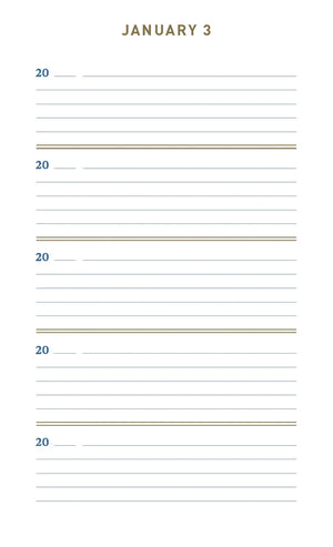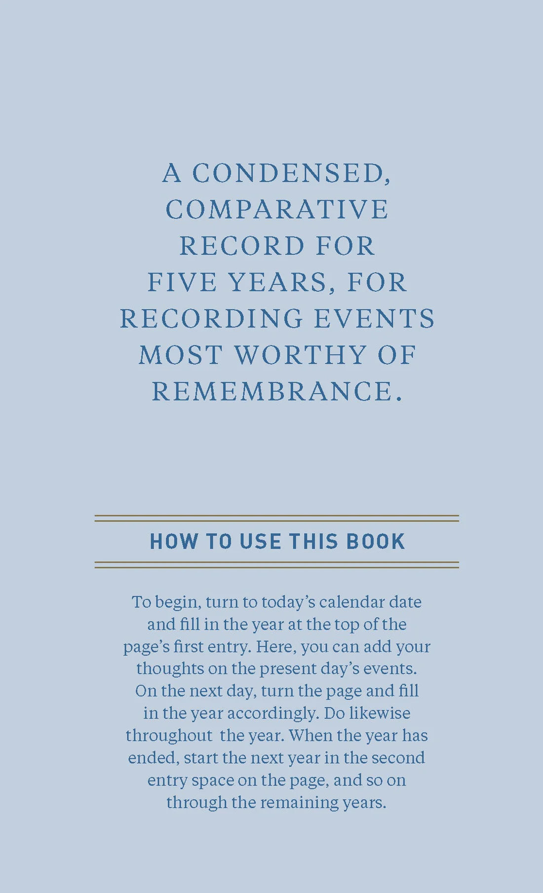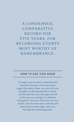 This keepsake memory book invites you to capture just a single quick line once a day over five years. As you write, the layout allows you to see your highlights and reflections on the same date in previous years. Uniquely rewarding, simple to complete, and presented in an exquisitely sleek package, this denim covered journal will become a treasure trove of memories to cherish forever.